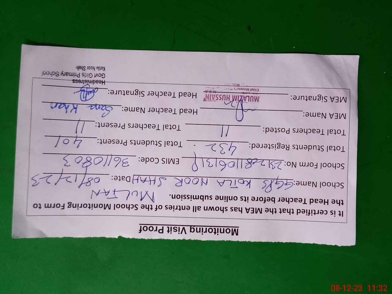 | EMIS Code: 36110803 | Name of School: GGPS KOTLA NOOR SHAH MUZAFARABAD | |||