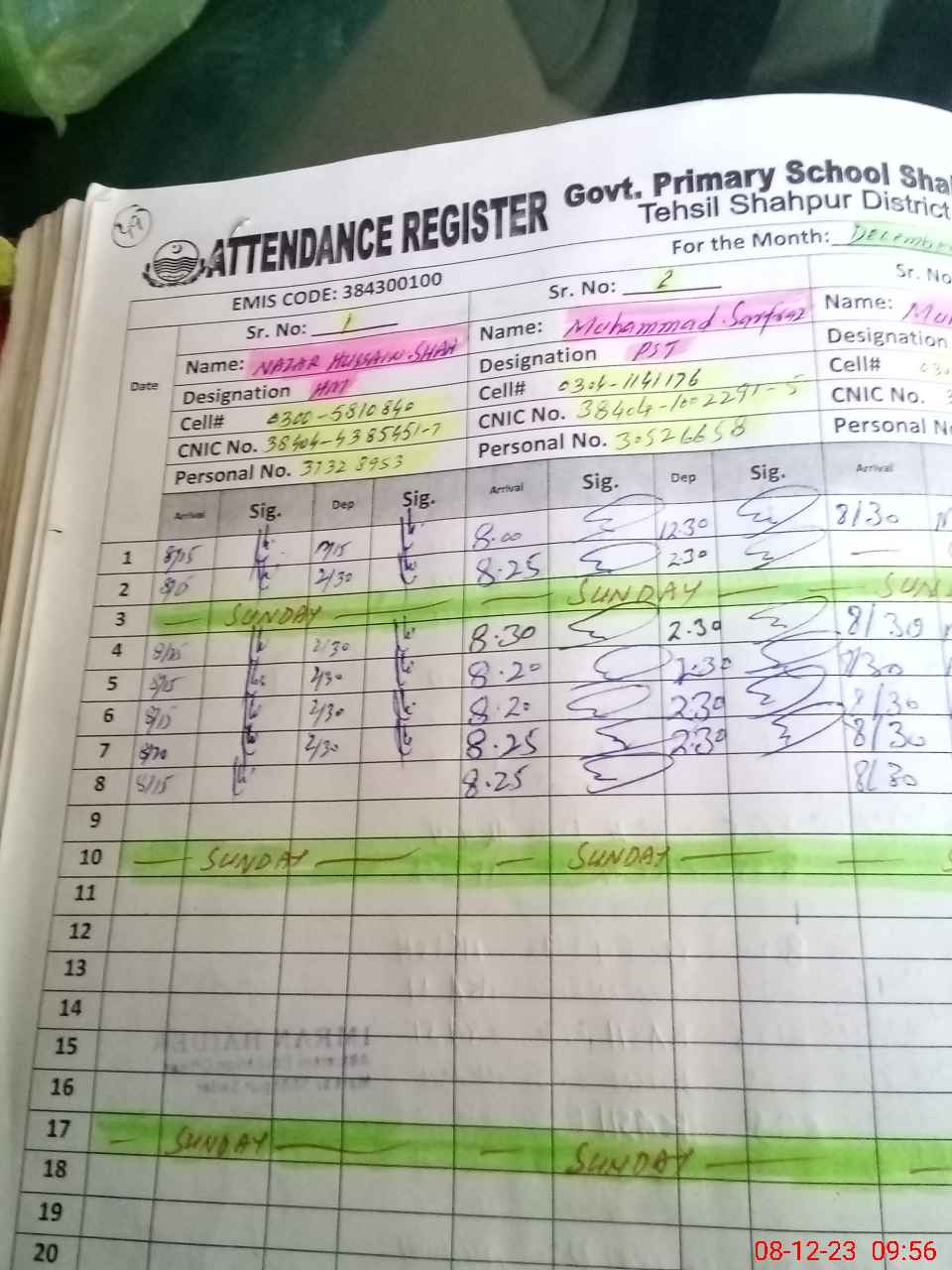 | CNIC | Full Name | Designation | R/C | Absence during last cal. month |