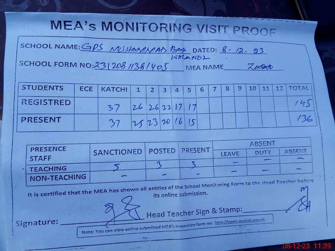 | Attendance Register | Head Teacher | MEA with School | Visit Proof |