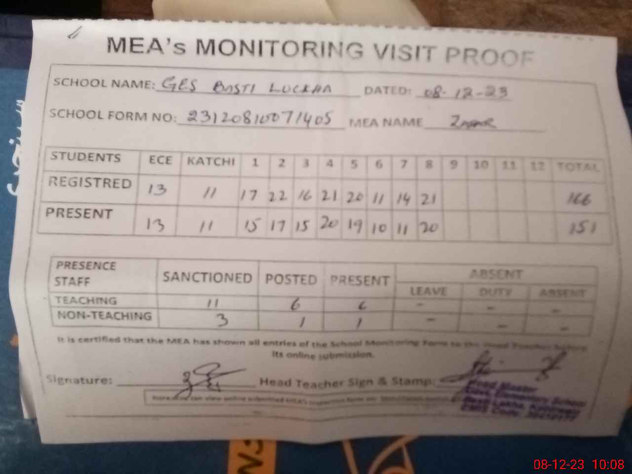 | Attendance Register | Head Teacher | MEA with School | Visit Proof |