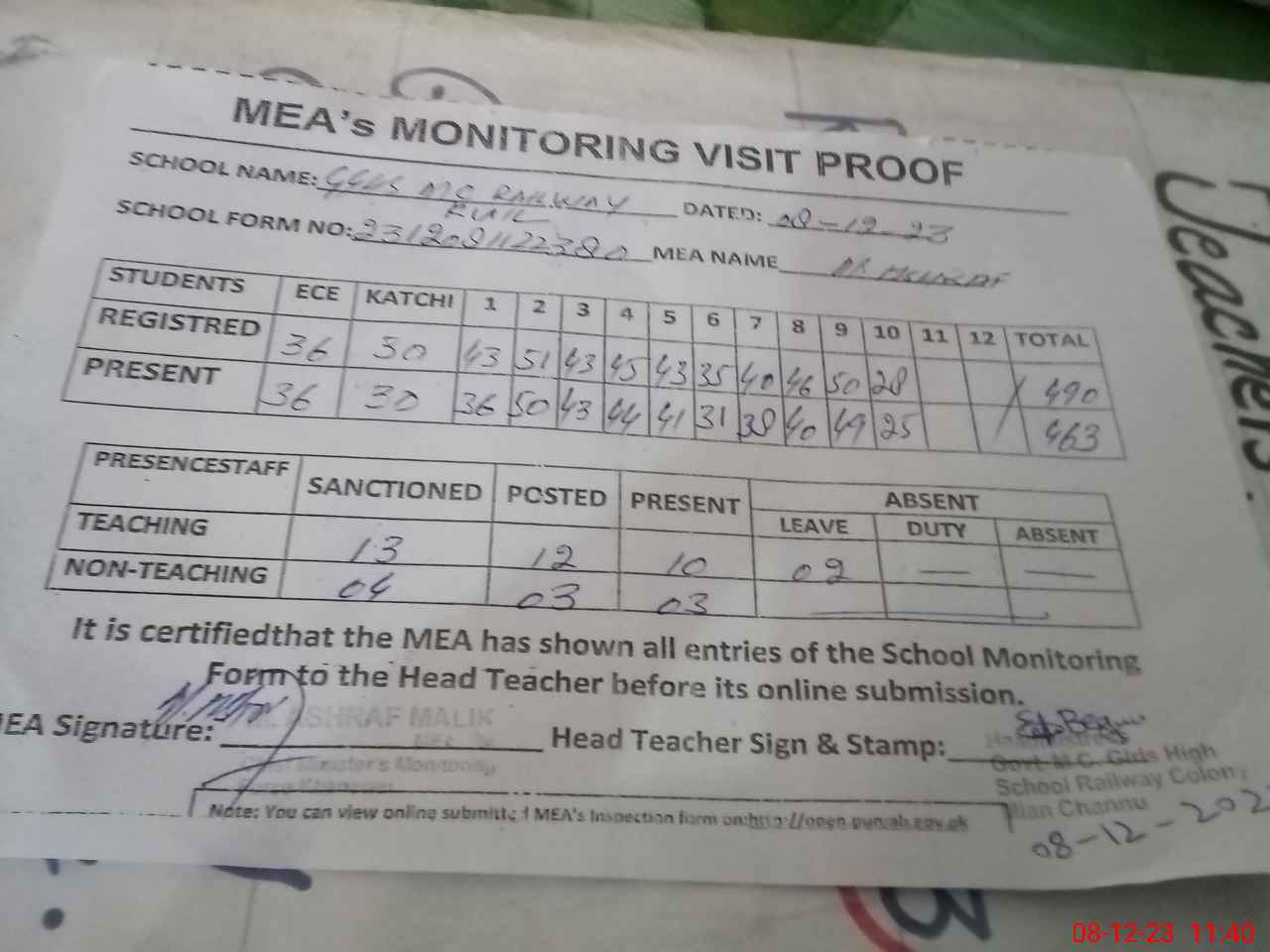 | Attendance Register | Head Teacher | MEA with School | Visit Proof |