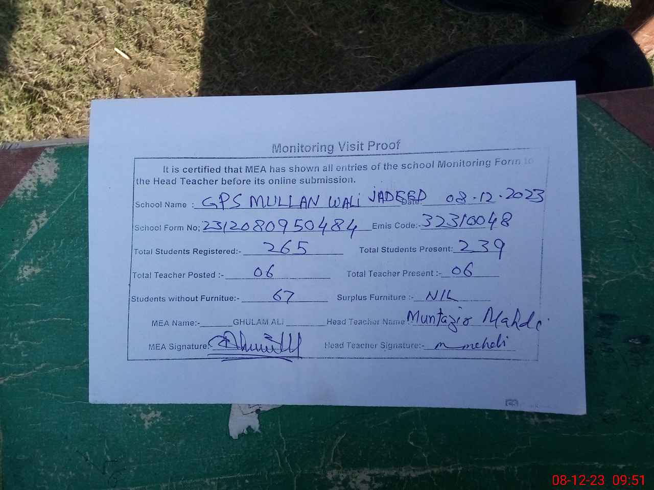 | EMIS Code: 32310048 | Name of School: GPS MULLAN WALI JADEED | |||