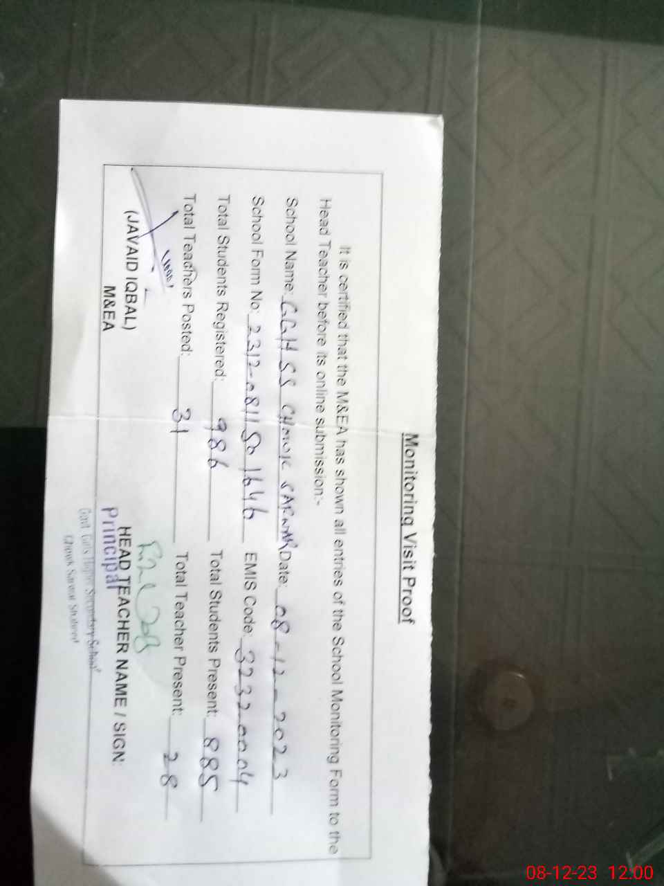 | Attendance Register | Head Teacher | MEA with School | Visit Proof |