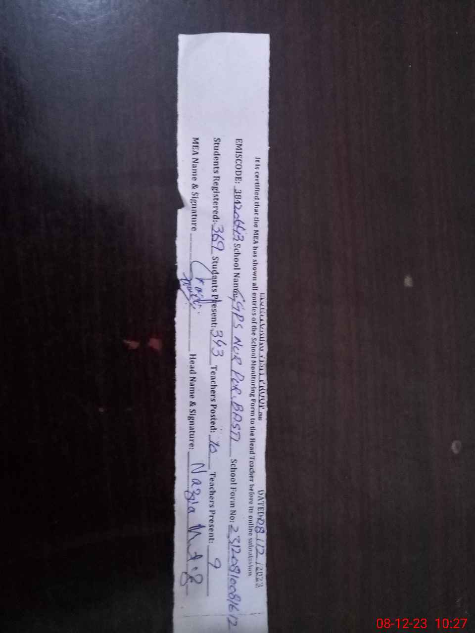 | Attendance Register | Head Teacher | MEA with School | Visit Proof |