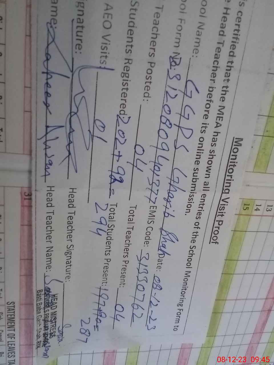 | Attendance Register | Head Teacher | MEA with School | Visit Proof |