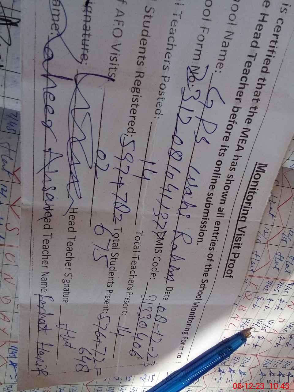 | Attendance Register | Head Teacher | MEA with School | Visit Proof |