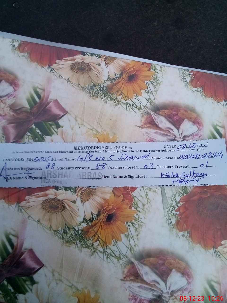 | EMIS Code: 38450215 | Name of School: GPS NO.5 SAHIWAL | |||