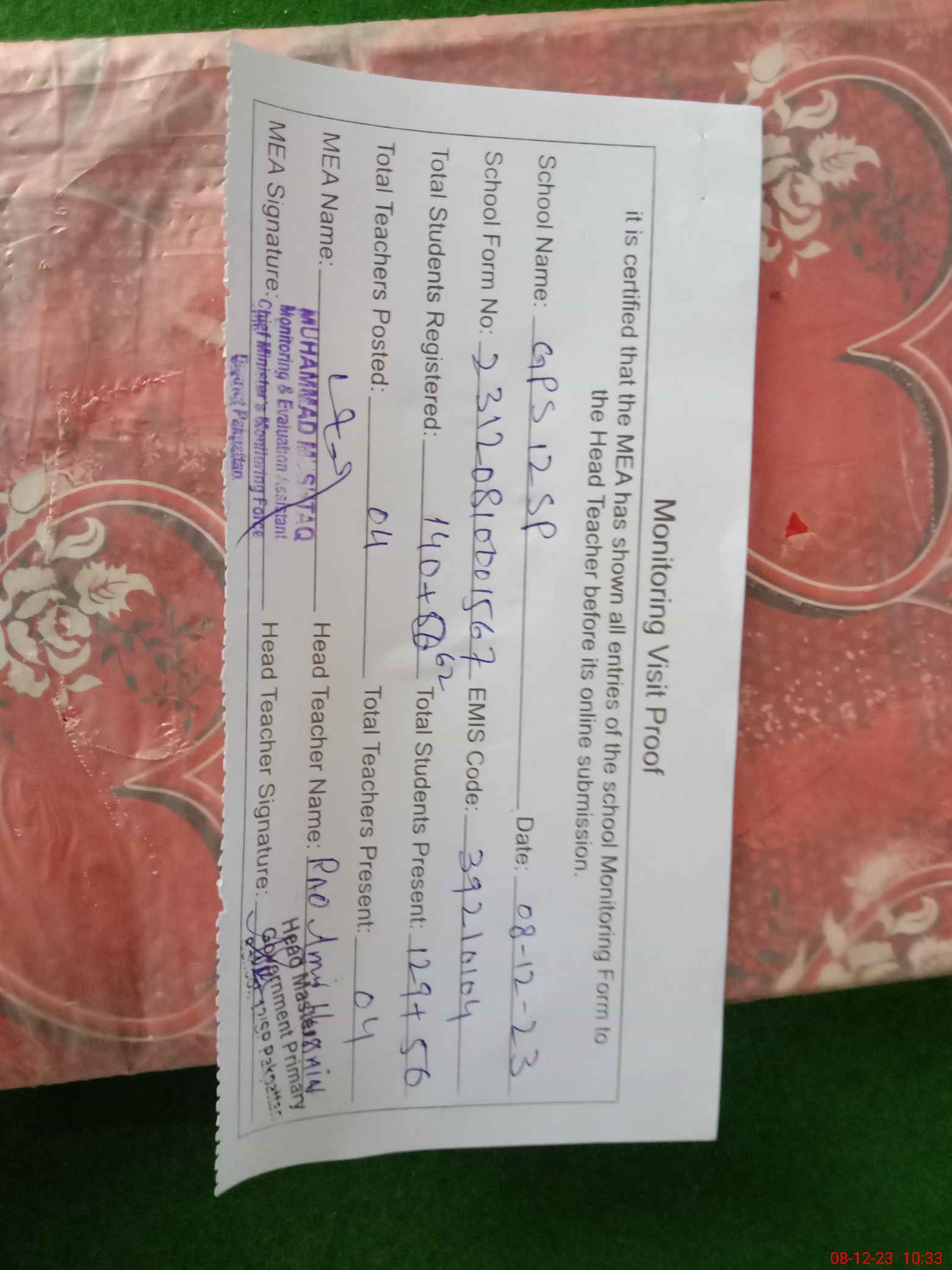 | Attendance Register | Head Teacher | MEA with School | Visit Proof |