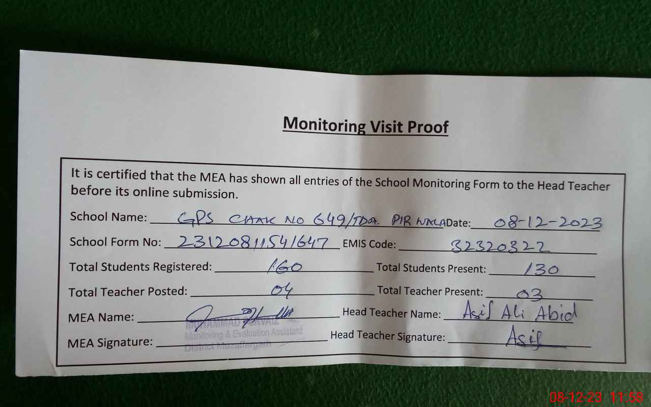 | Attendance Register | Head Teacher | MEA with School | Visit Proof |