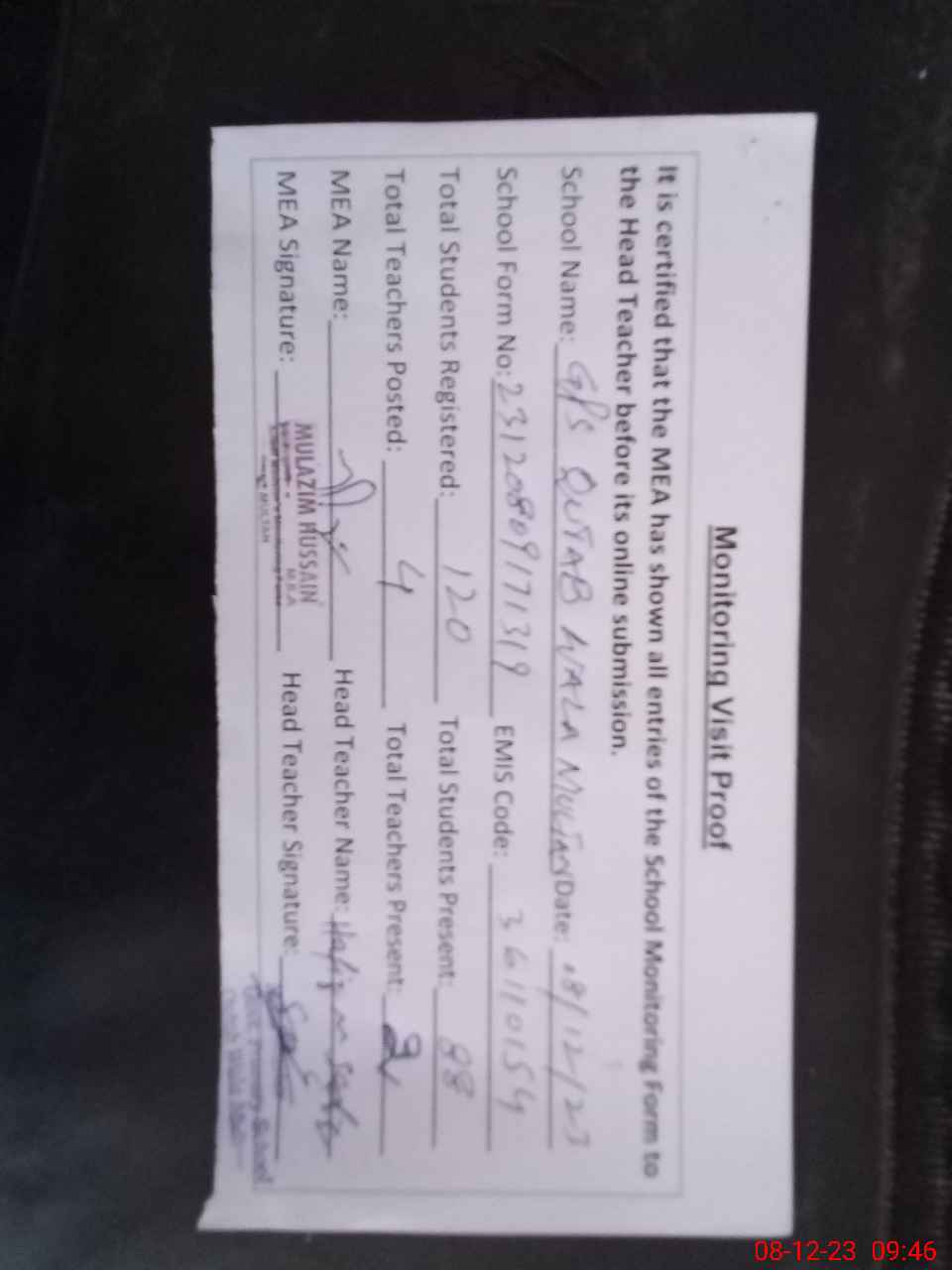 | EMIS Code: 36110154 | Name of School: GPS QUTTUB WALA ISMAIL ABAD P/O MULTAN | |||