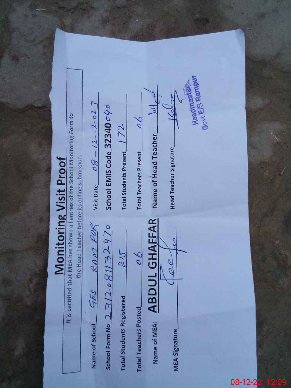 | Attendance Register | Head Teacher | MEA with School | Visit Proof |