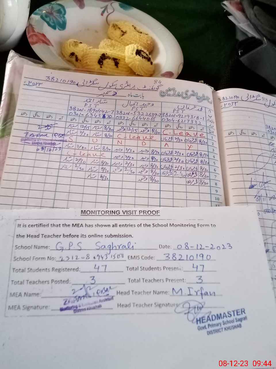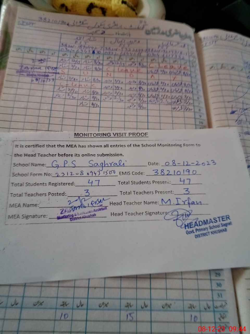 | Attendance Register | Head Teacher | MEA with School | Visit Proof |