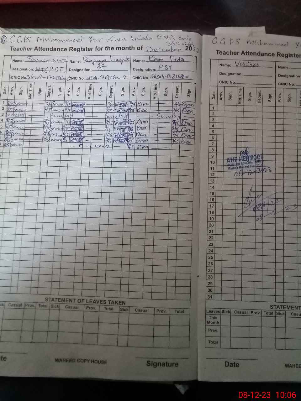 | CNIC | Full Name | Designation | R/C | Absence During Last Calender Month |
