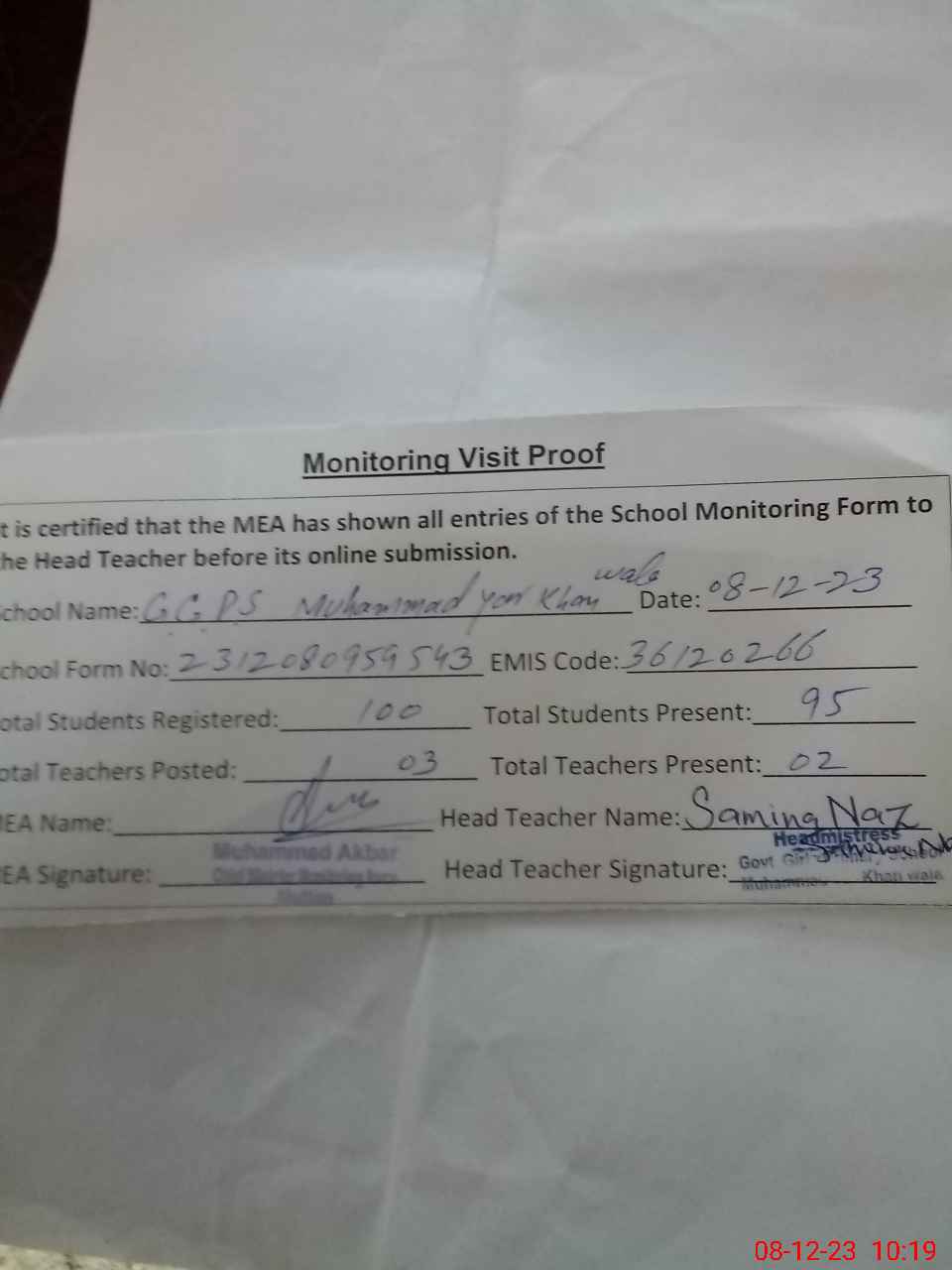 | Attendance Register | Head Teacher | MEA with School | Visit Proof |