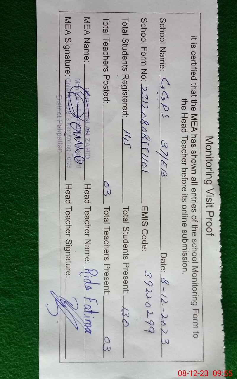 | Attendance Register | Head Teacher | MEA with School | Visit Proof |