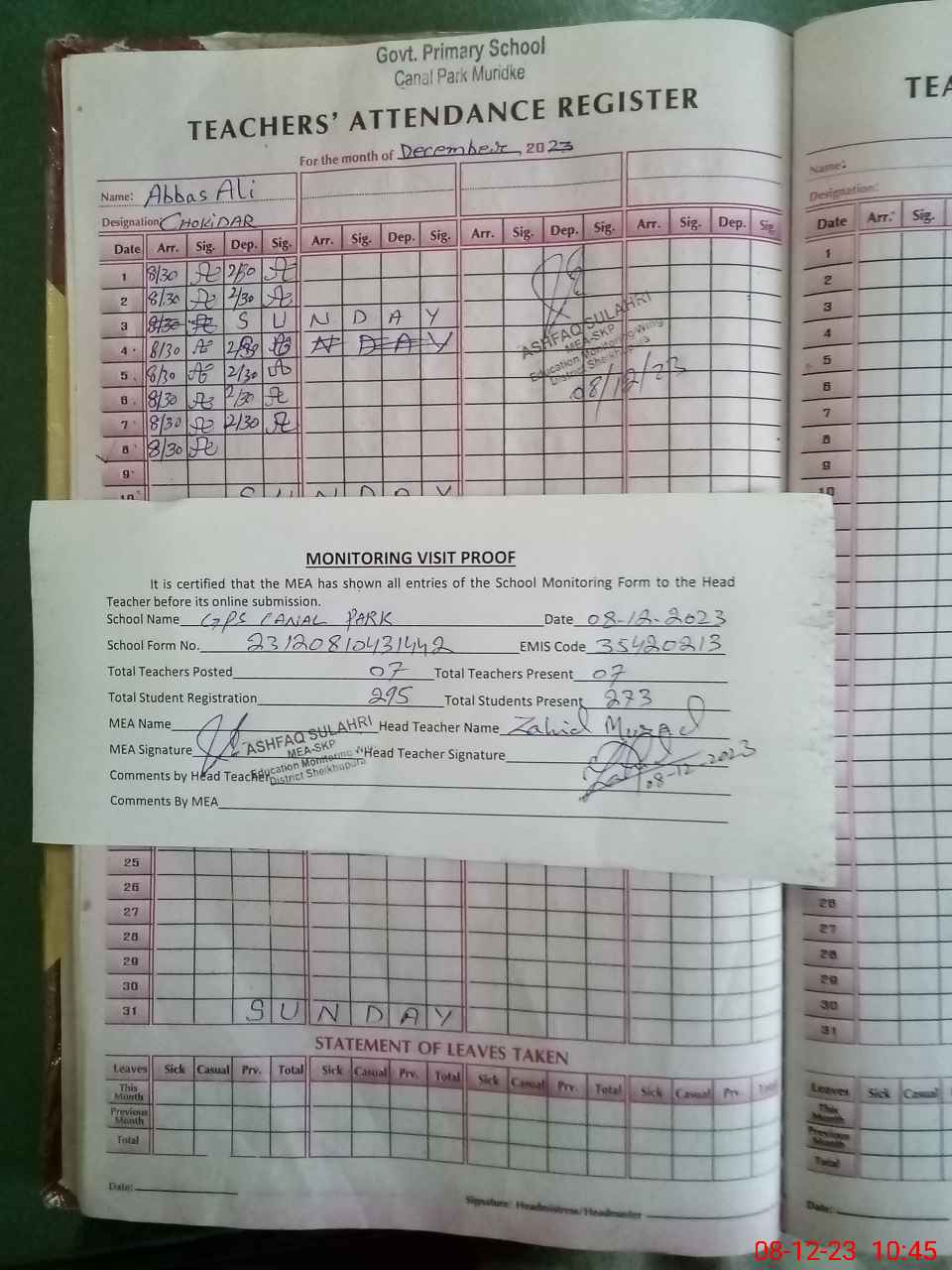| Attendance Register | Head Teacher | MEA with School | Visit Proof |