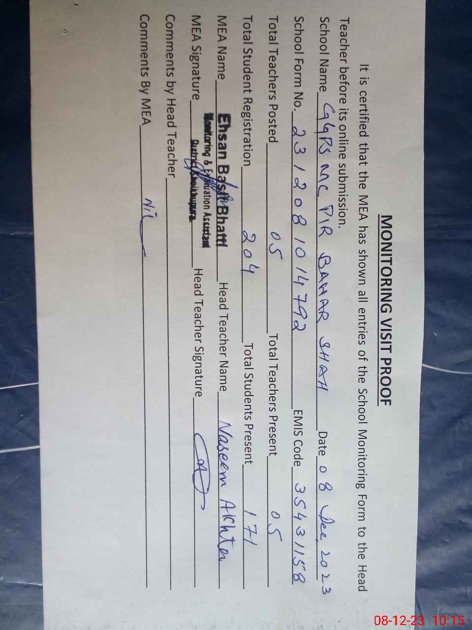 | EMIS Code: 35431158 | Name of School: GGPS MC PIR BAHAR SHAH | |||