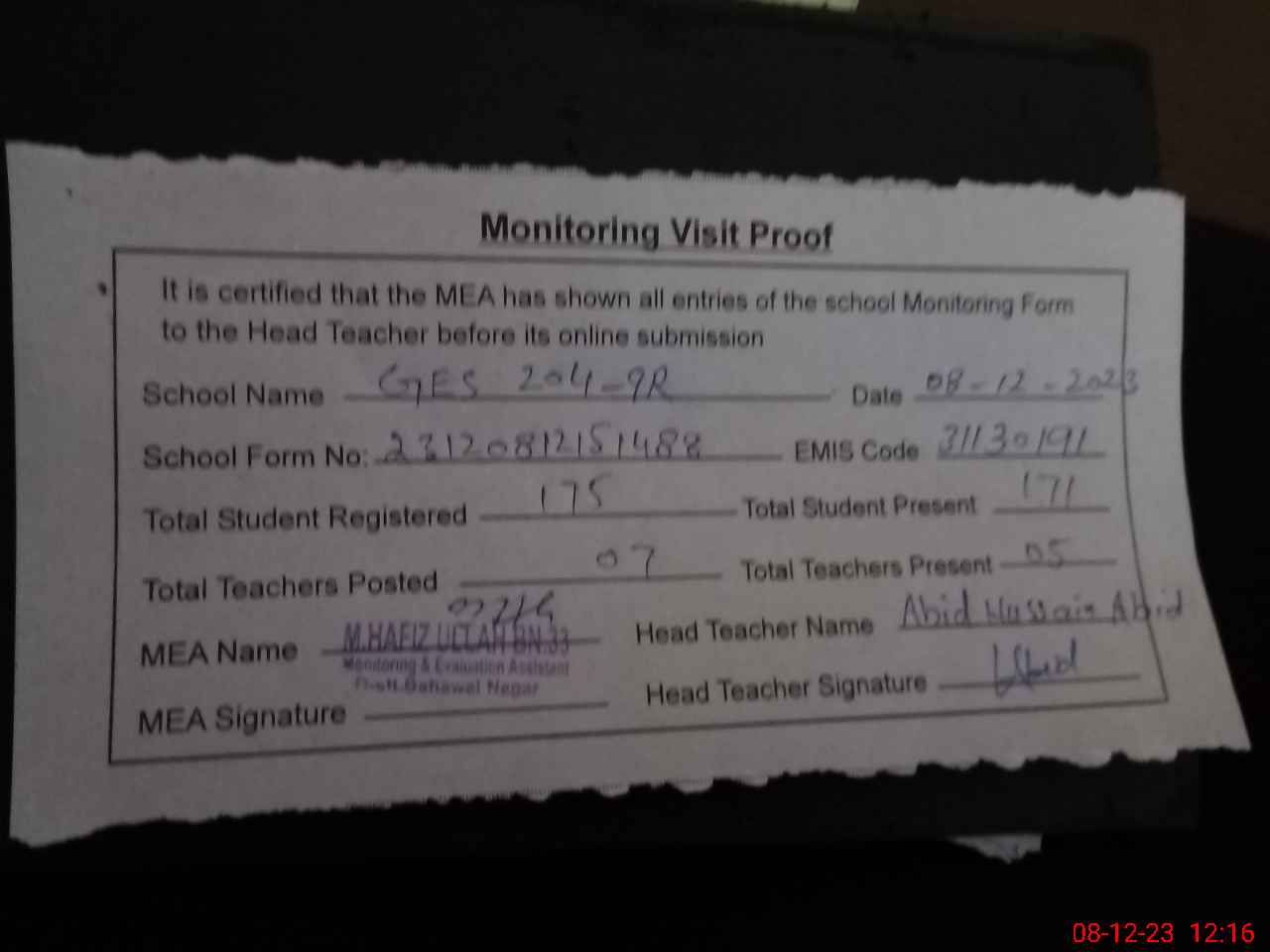 | Attendance Register | Head Teacher | MEA with School | Visit Proof |