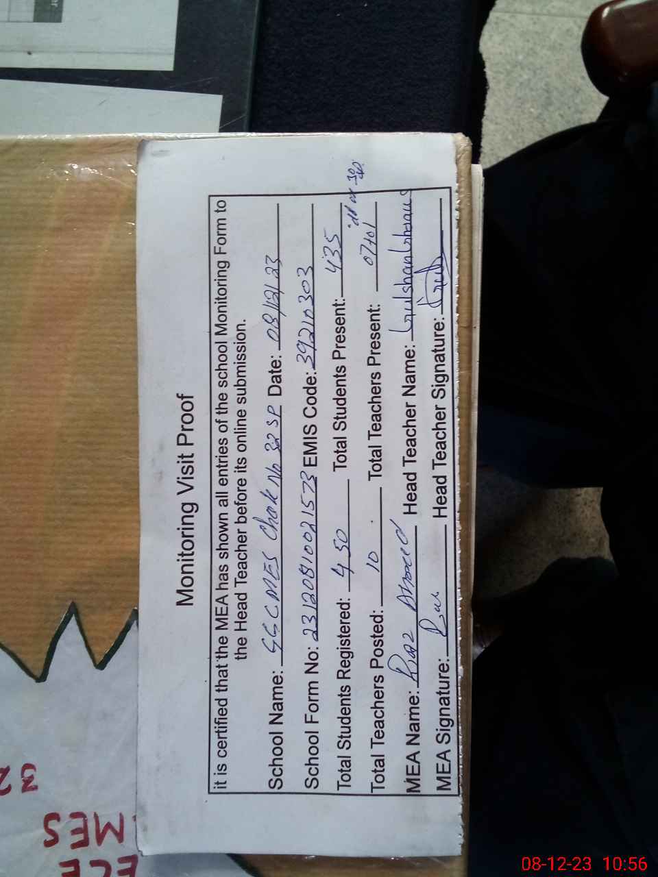 | Attendance Register | Head Teacher | MEA with School | Visit Proof |