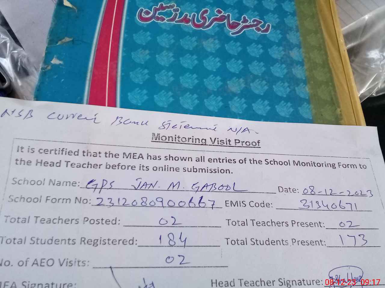 | Attendance Register | Head Teacher | MEA with School | Visit Proof |