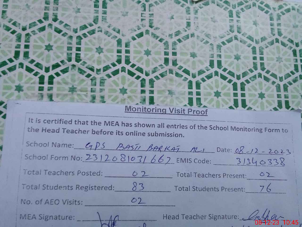 | Attendance Register | Head Teacher | MEA with School | Visit Proof |