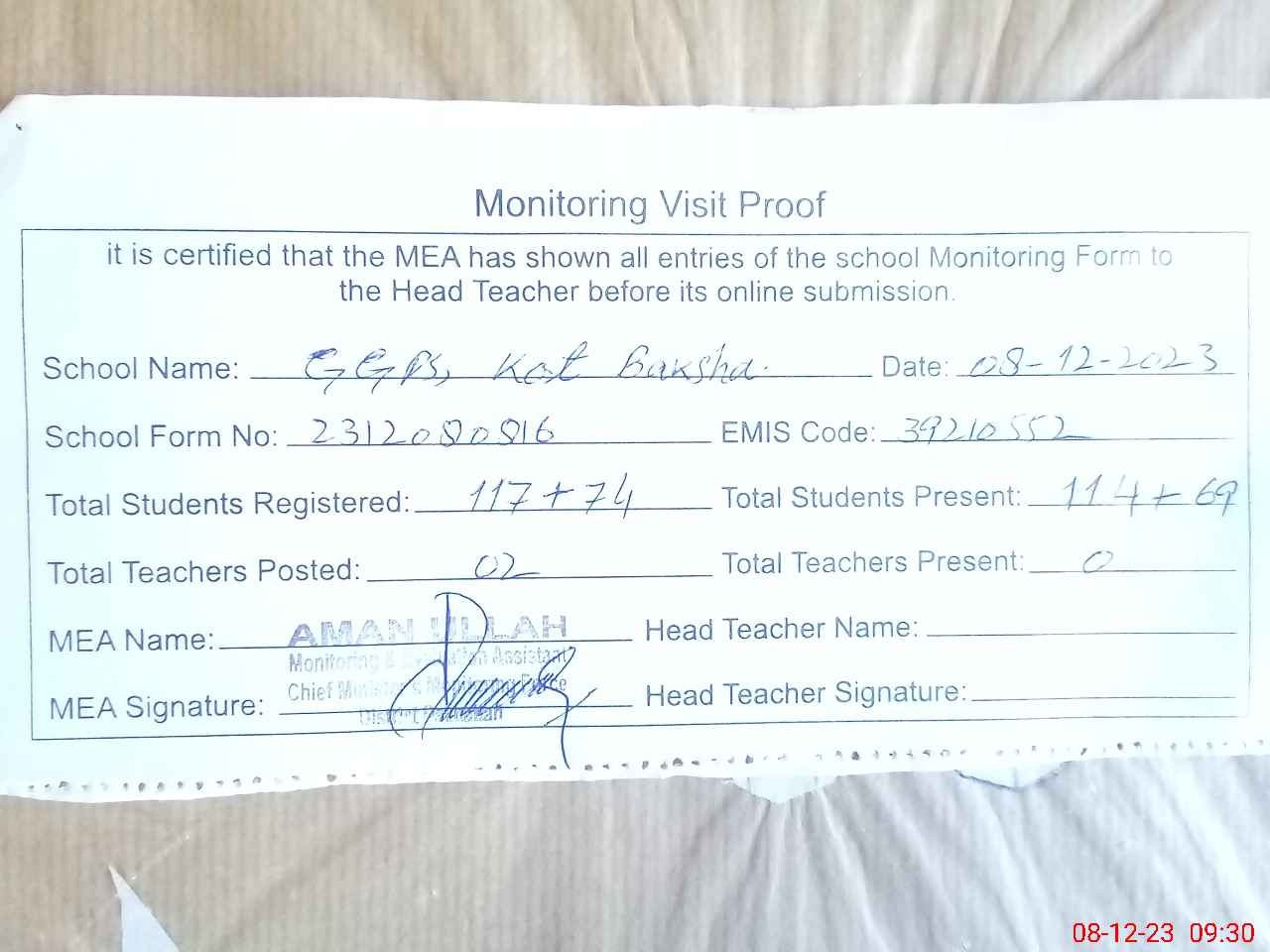 | EMIS Code: 39210552 | Name of School: GGPS KOT BAKHSHA | |||
