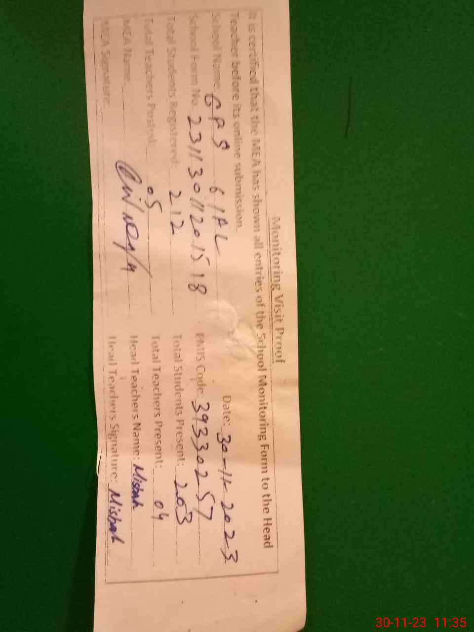 | Attendance Register | Head Teacher | MEA with School | Visit Proof |