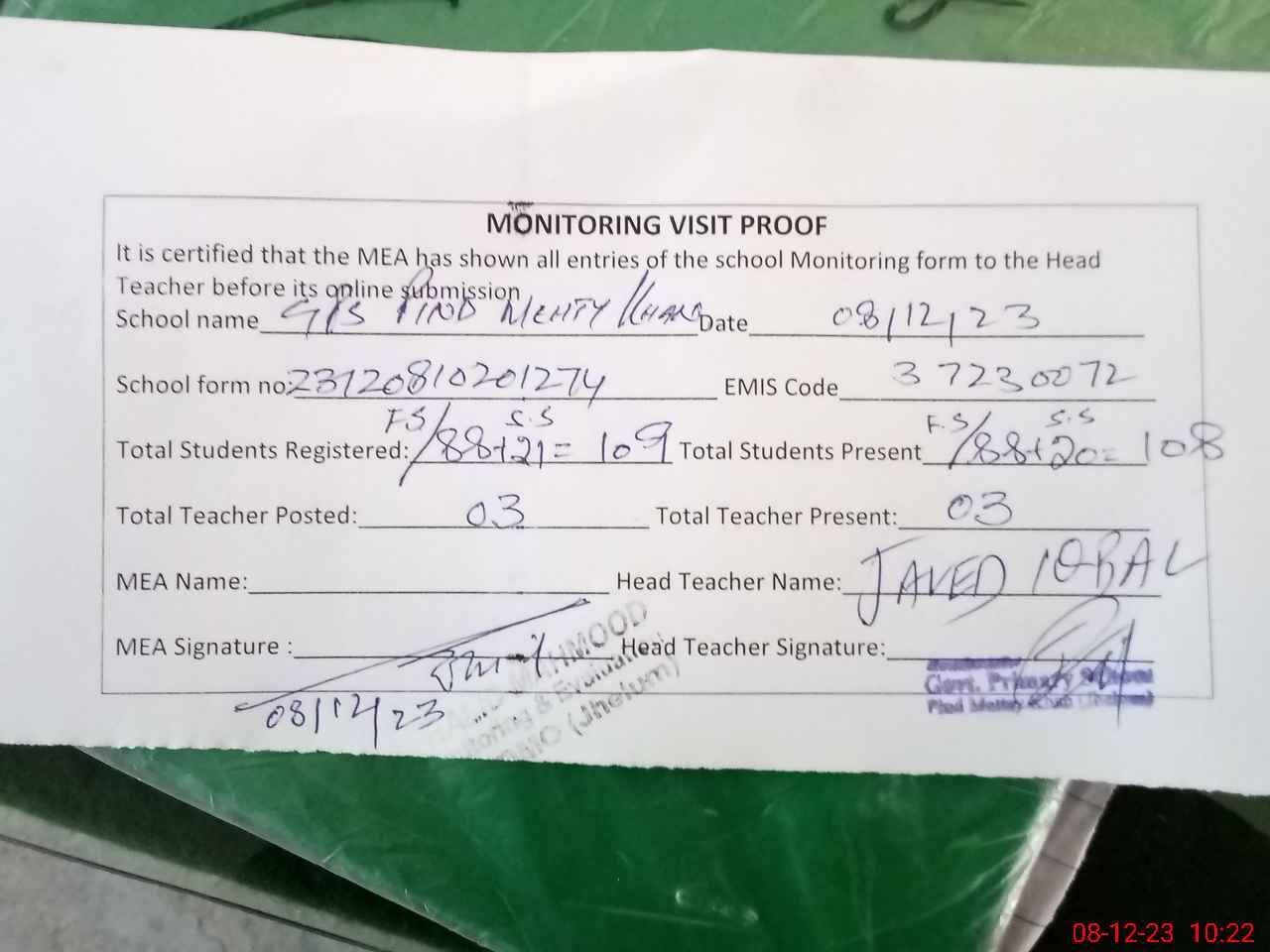 | Attendance Register | Head Teacher | MEA with School | Visit Proof |