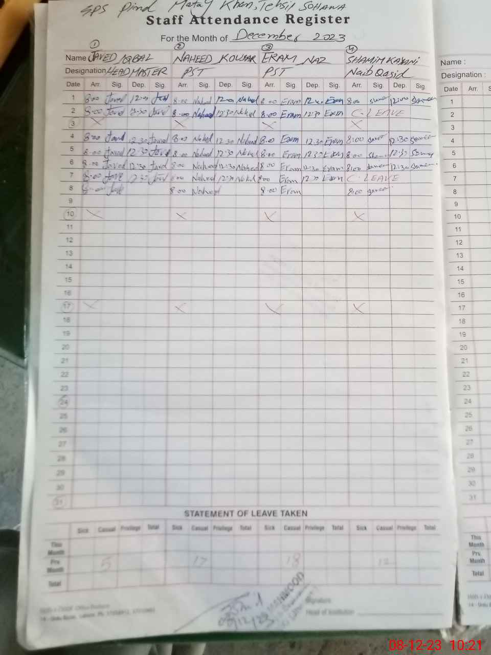 | CNIC | Full Name | Designation | R/C | Absence During Last Calender Month |
