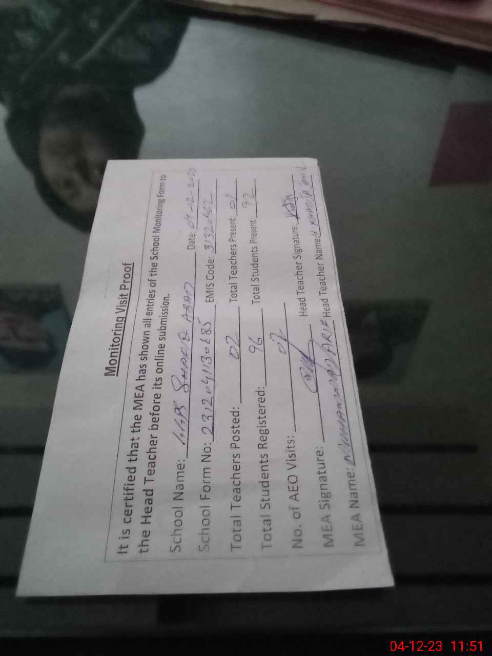 | Attendance Register | Head Teacher | MEA with School | Visit Proof |