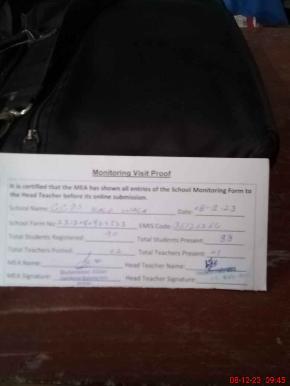 | Attendance Register | Head Teacher | MEA with School | Visit Proof |