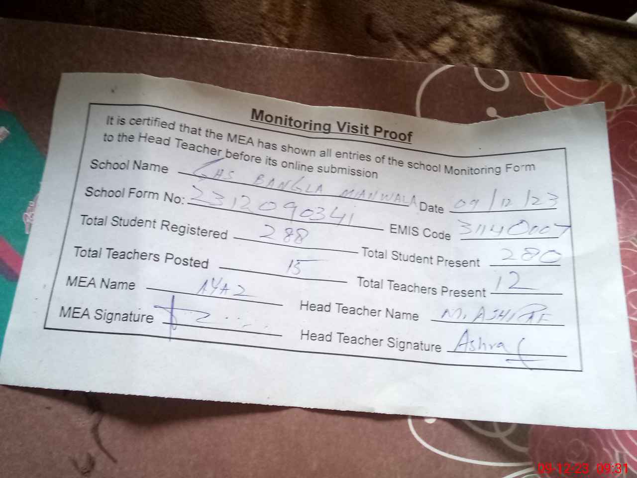 | Attendance Register | Head Teacher | MEA with School | Visit Proof |