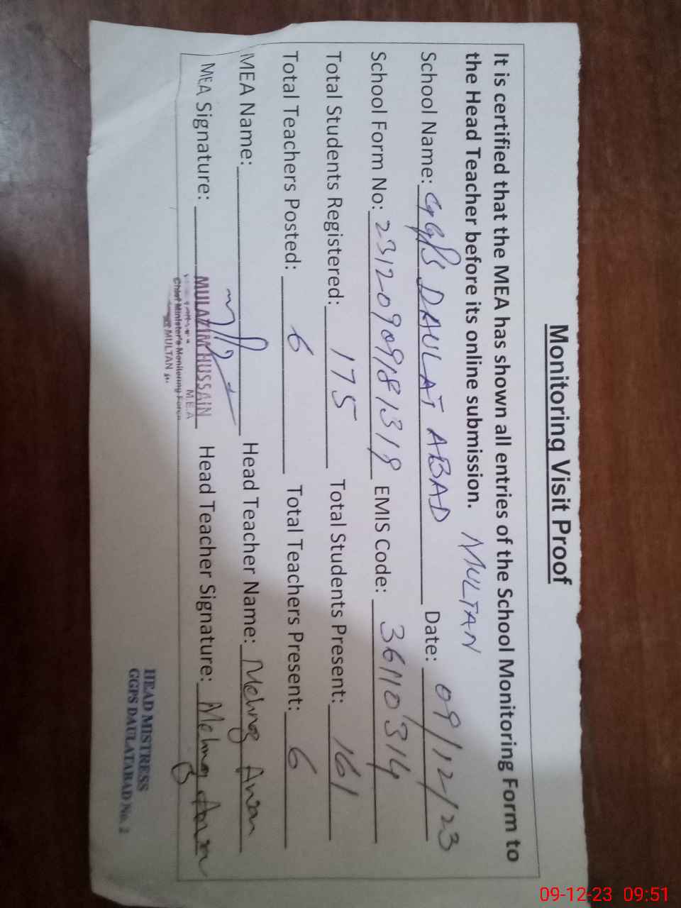 | EMIS Code: 36110314 | Name of School: GGPS DAULAT ABAD NO.2 MULTAN | |||