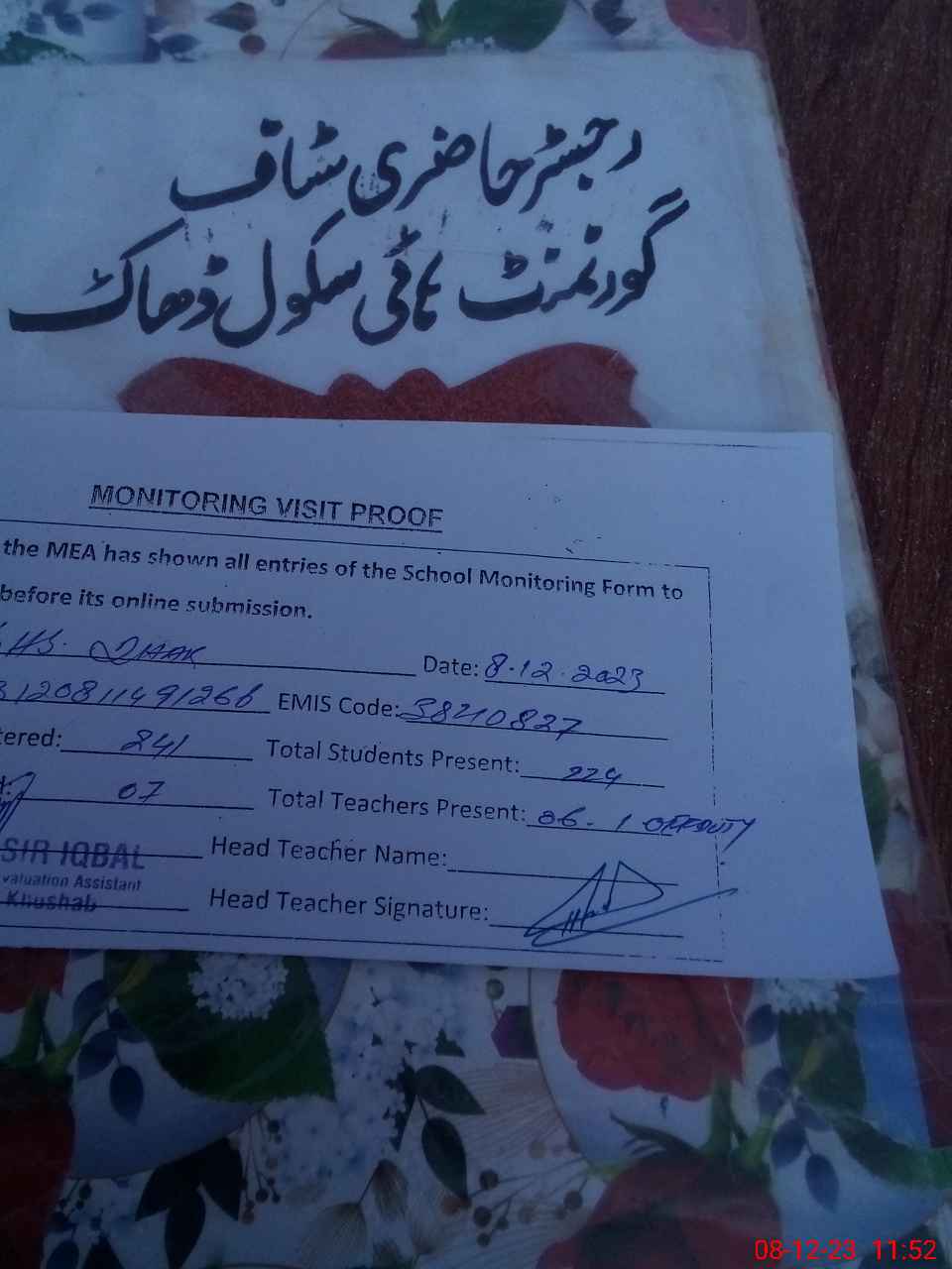 | Attendance Register | Head Teacher | MEA with School | Visit Proof |