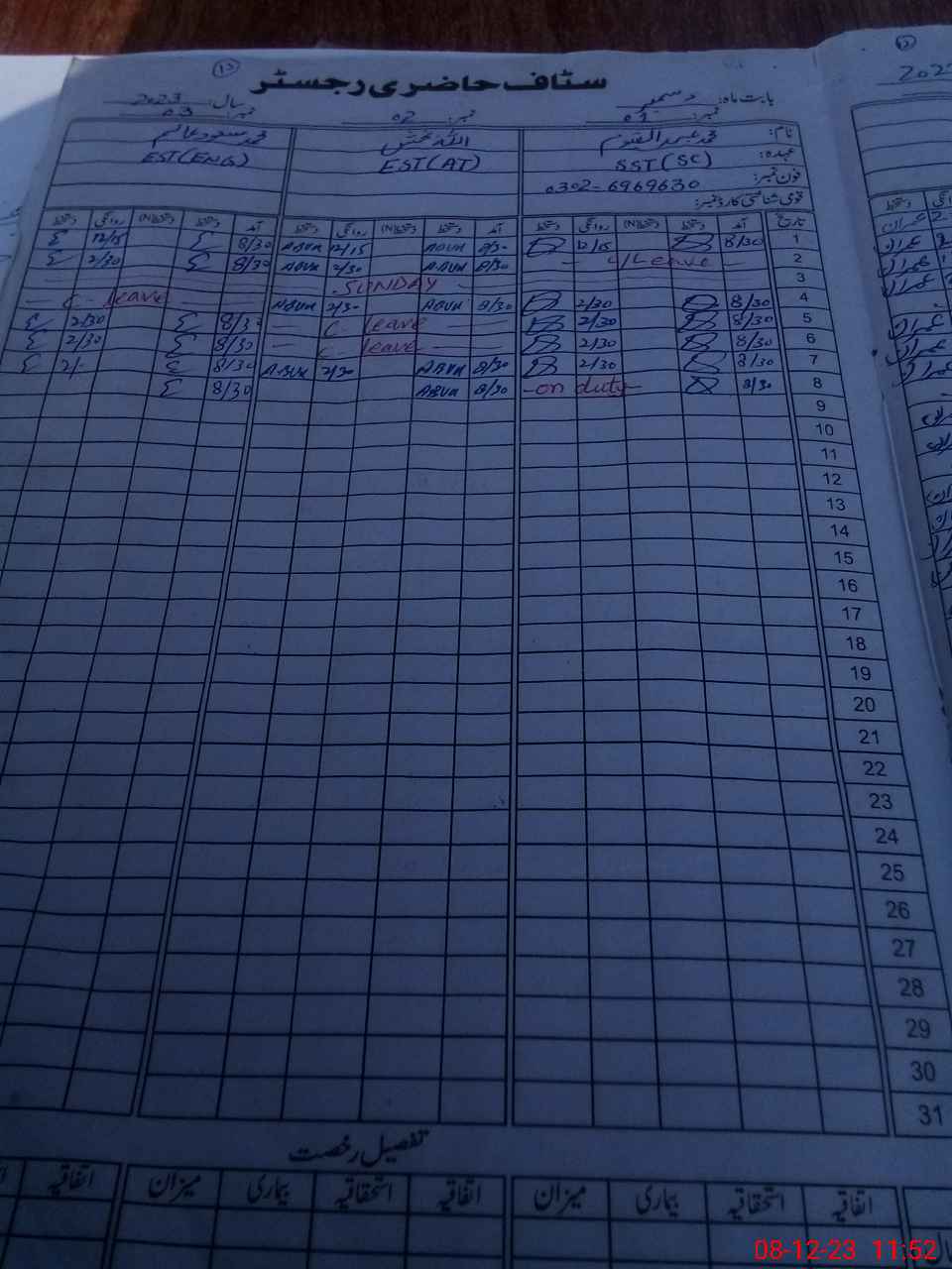 | CNIC | Full Name | Designation | R/C | Absence During Last Calender Month |