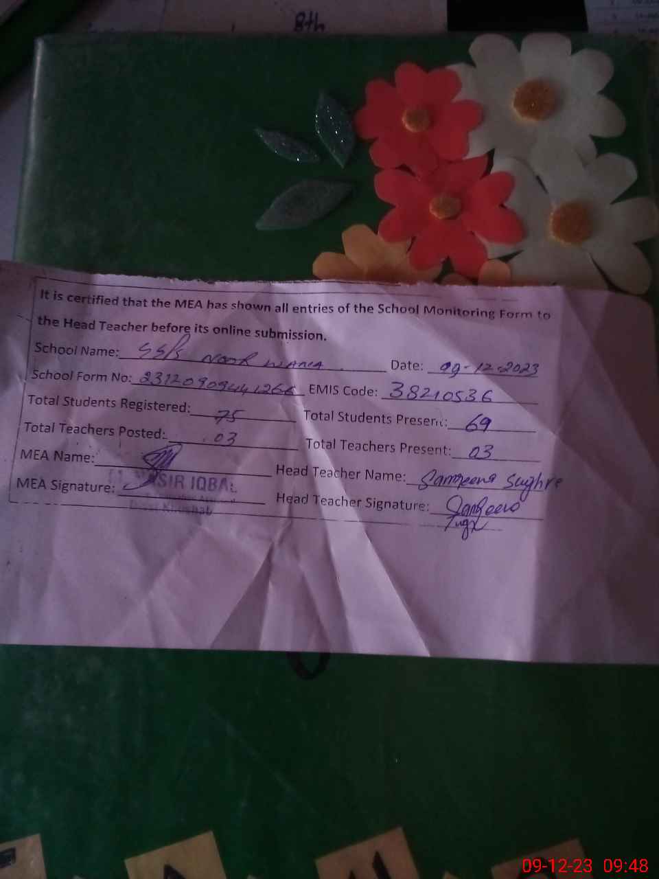 | Certified that this School was Inspected by the Undersigned MEA/DMO Today and the Information Stated Above is as Per Record. | |||||