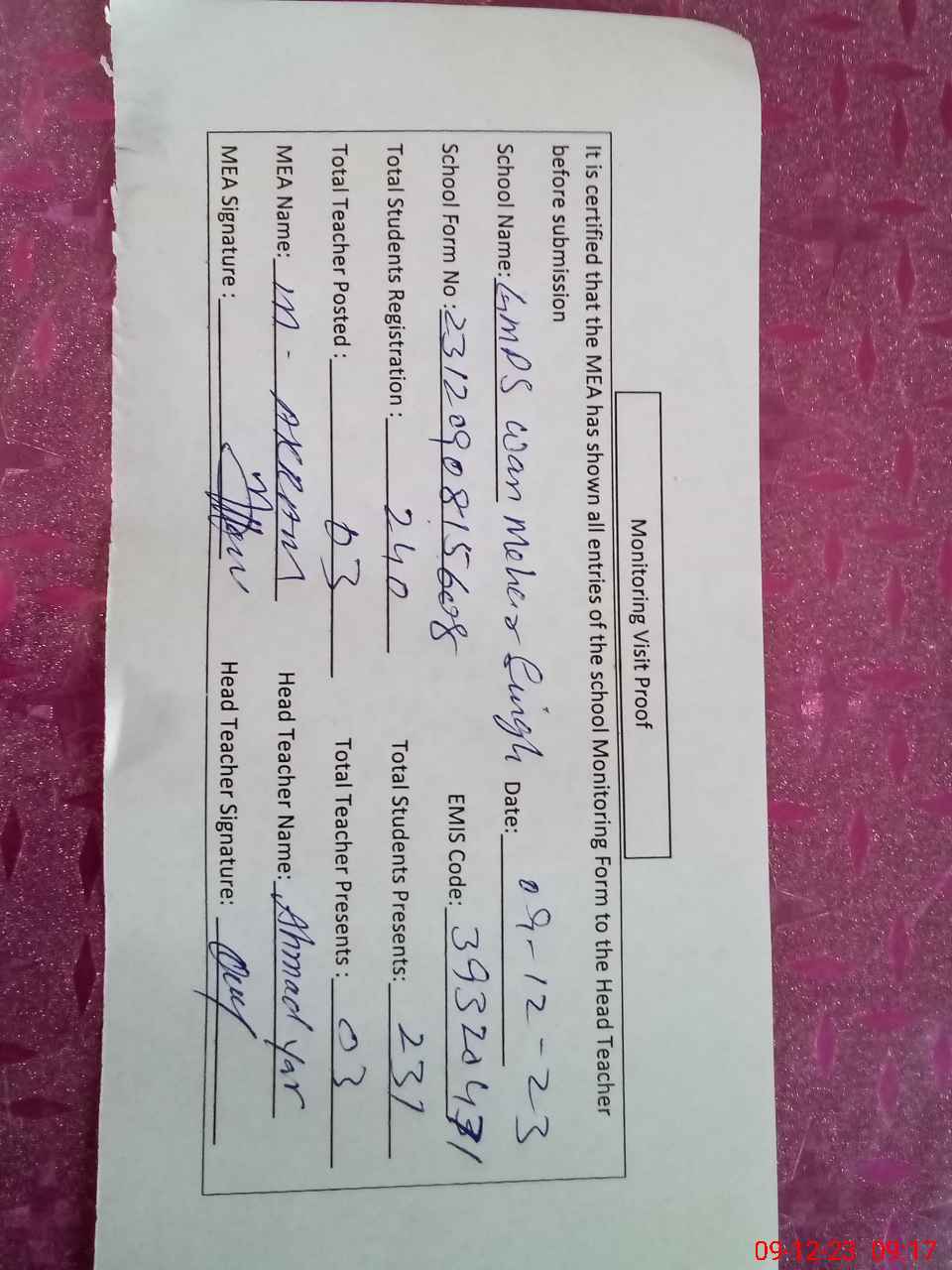 | EMIS Code: 39320471 | Name of School: GMPS WAN MEHR SINGH | |||