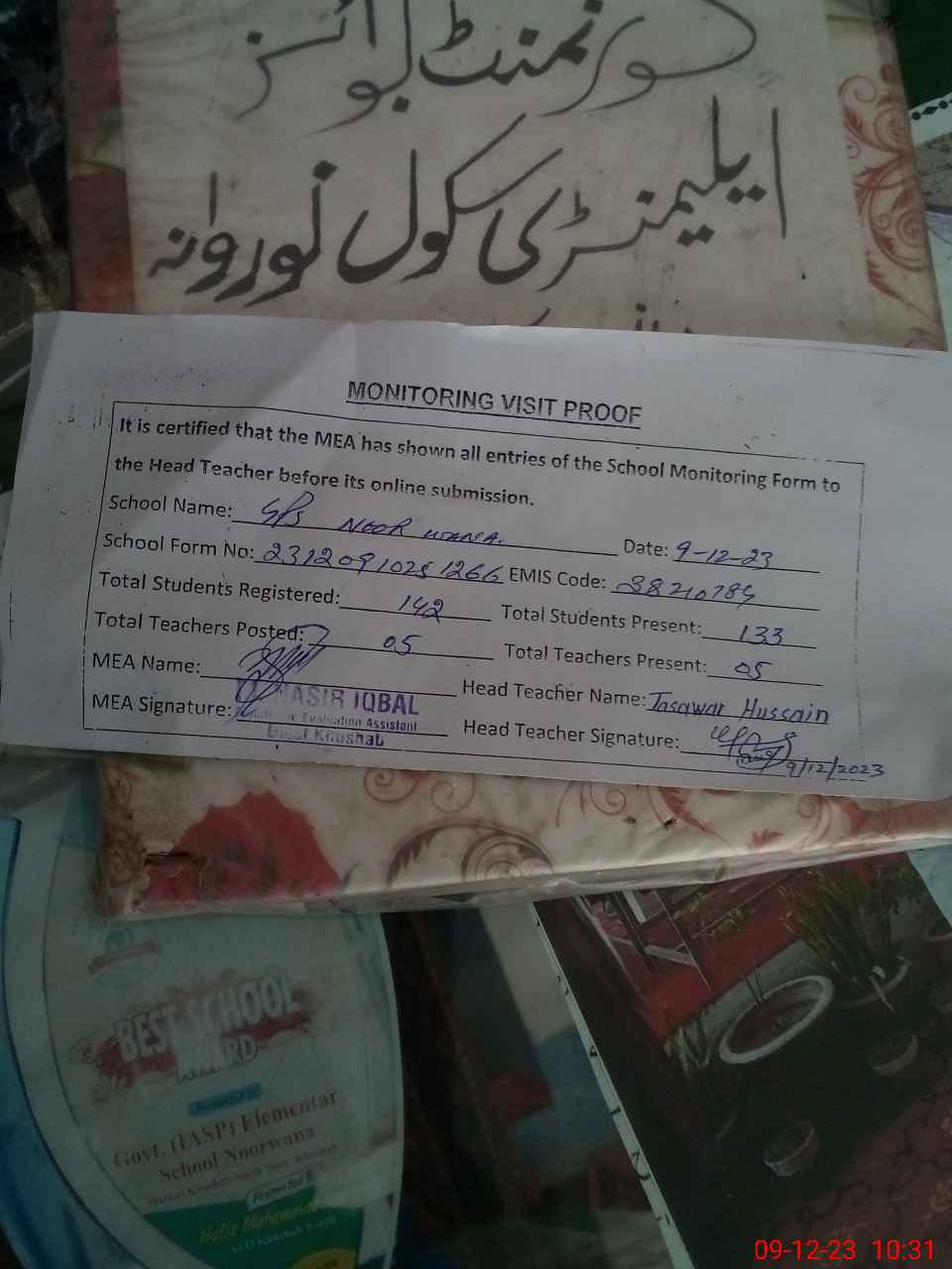 | Attendance Register | Head Teacher | MEA with School | Visit Proof |