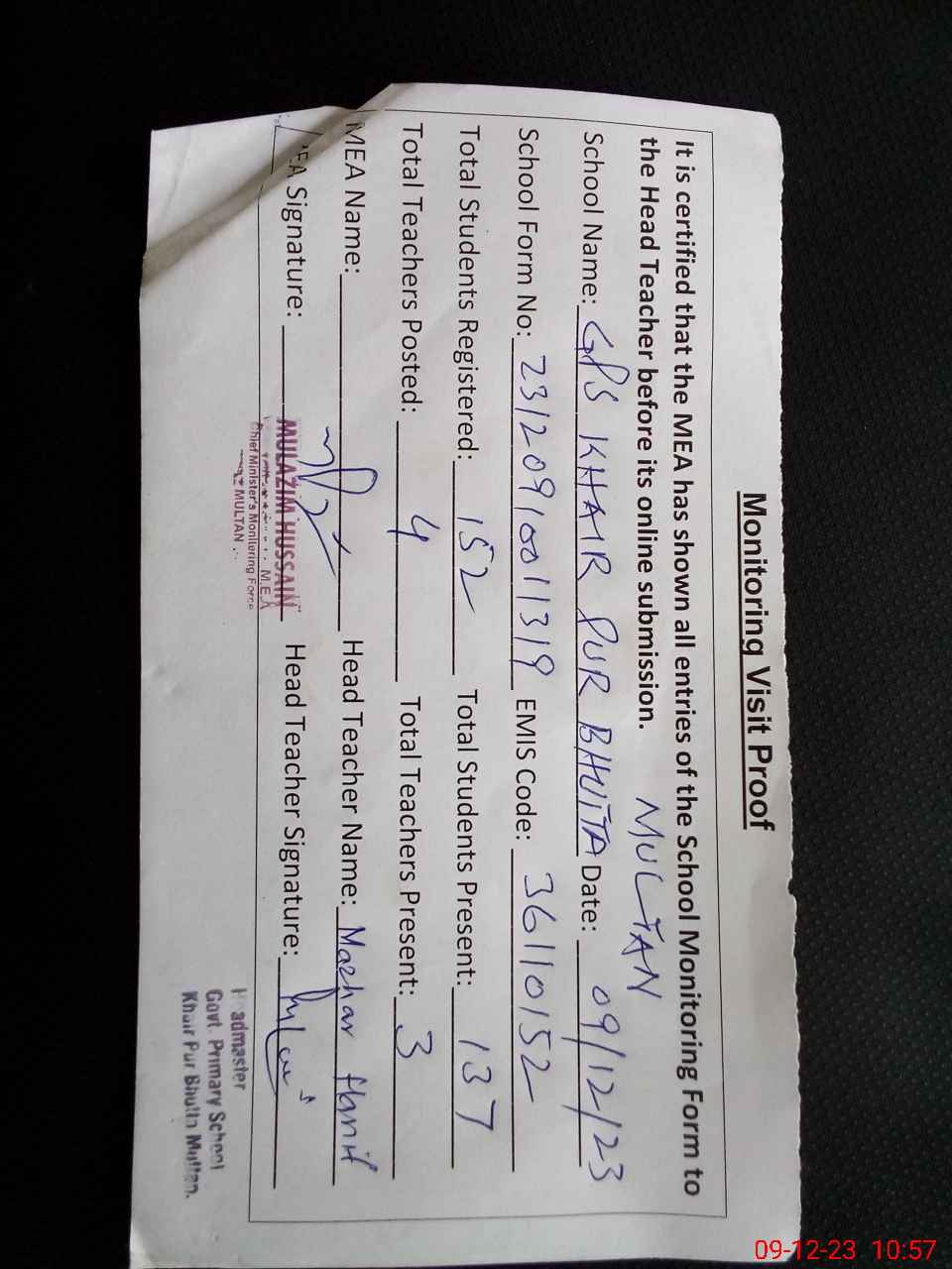 | Attendance Register | Head Teacher | MEA with School | Visit Proof |