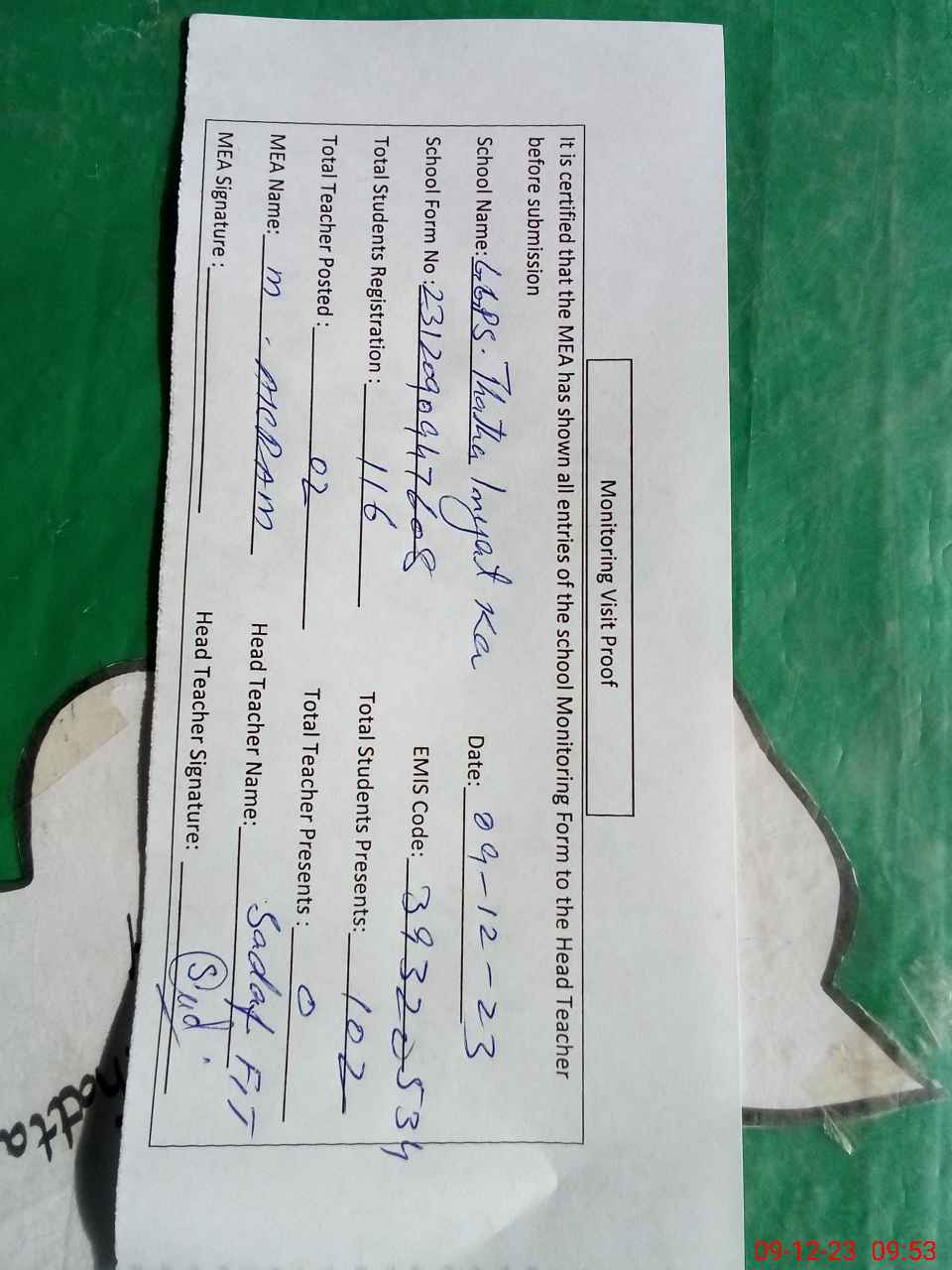 | Attendance Register | Head Teacher | MEA with School | Visit Proof |