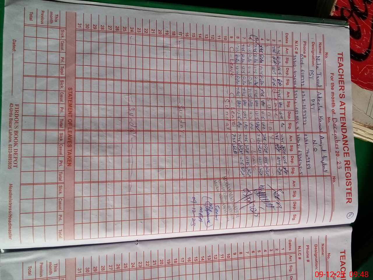 | CNIC | Full Name | Designation | R/C | Absence During Last Calender Month |