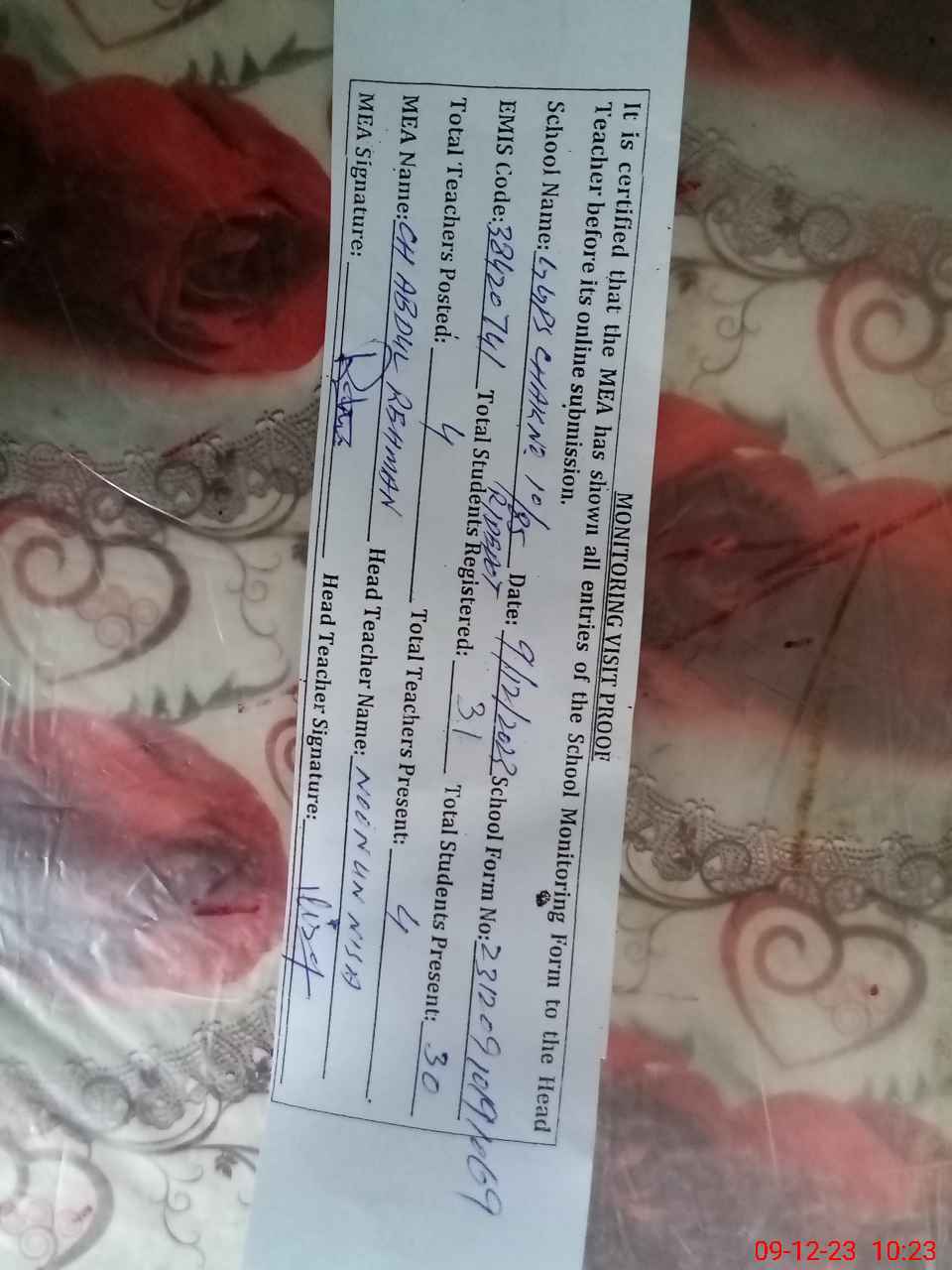 | Attendance Register | Head Teacher | MEA with School | Visit Proof |