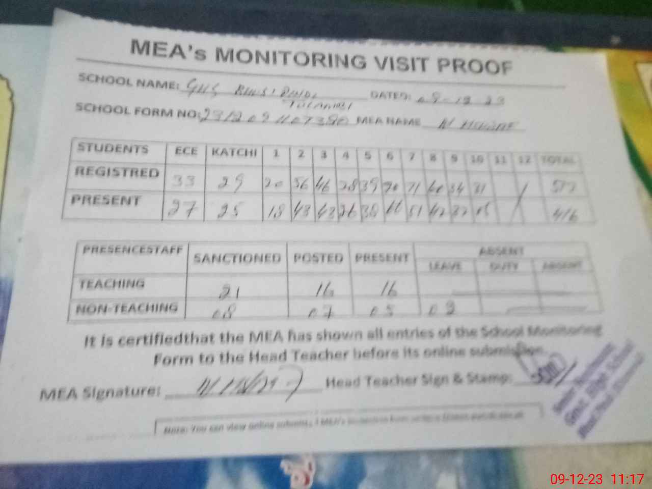 | Attendance Register | Head Teacher | MEA with School | Visit Proof |