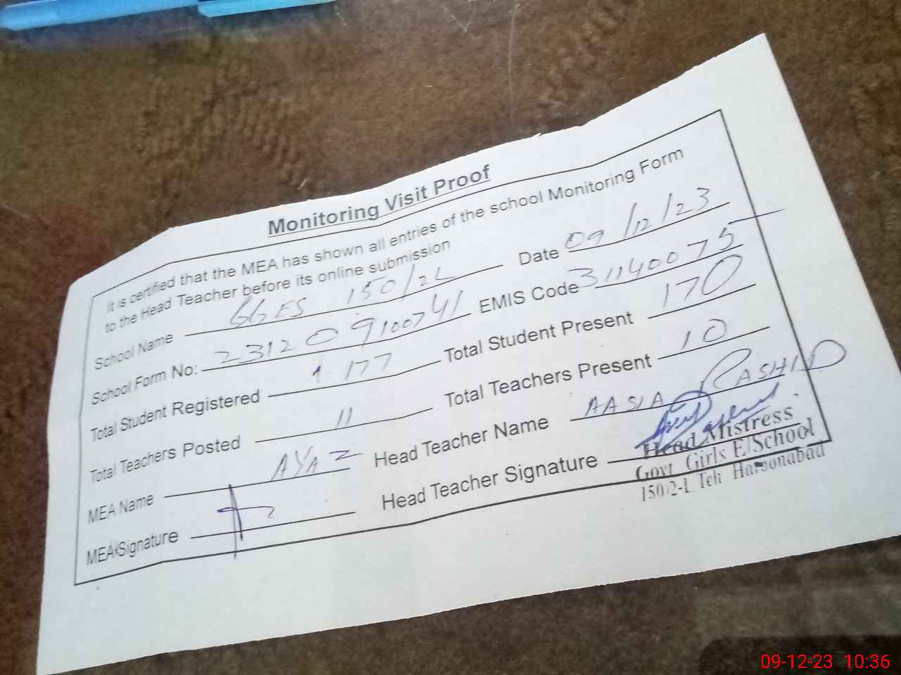 | Attendance Register | Head Teacher | MEA with School | Visit Proof |