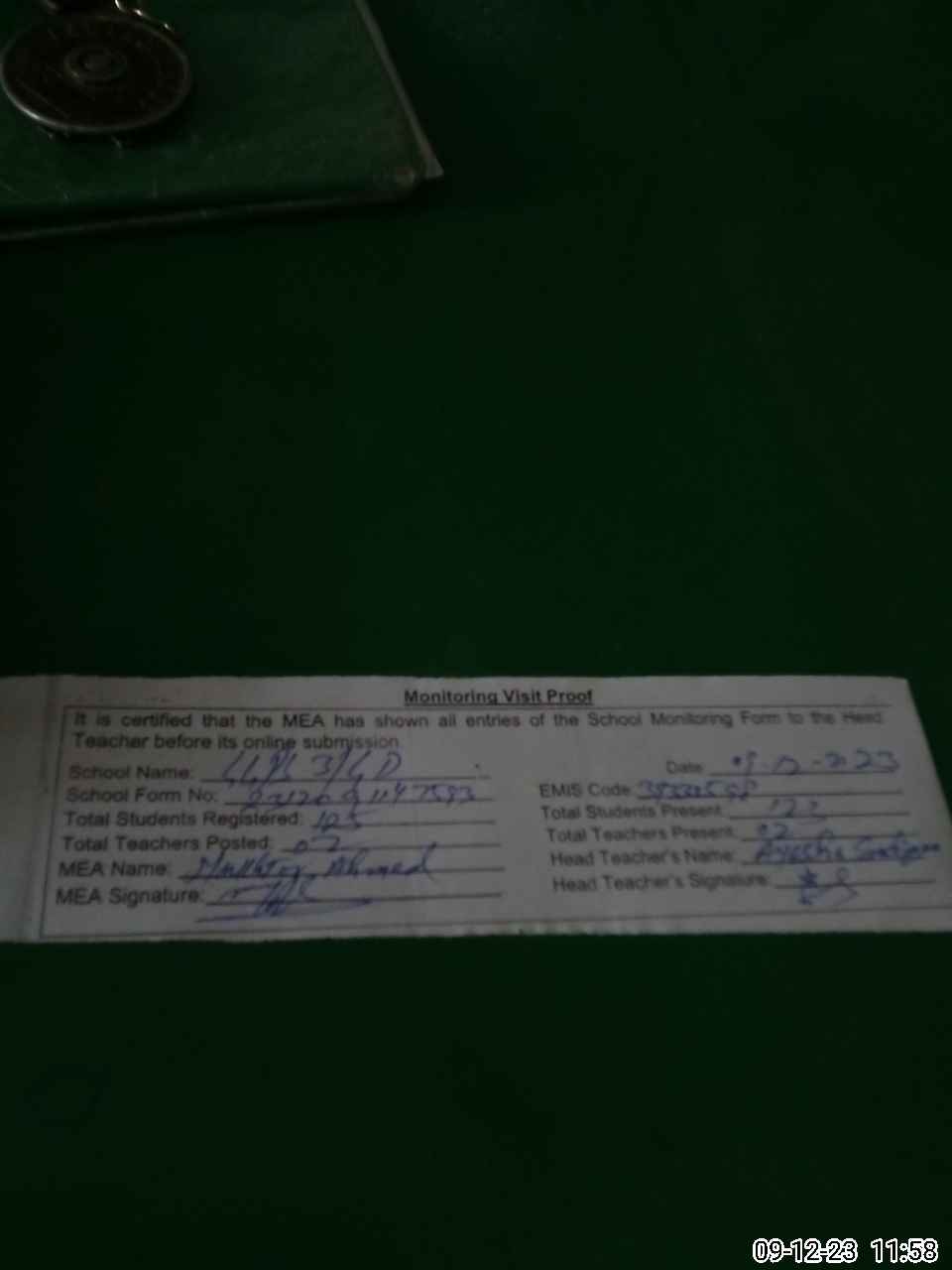 | Attendance Register | Head Teacher | MEA with School | Visit Proof |