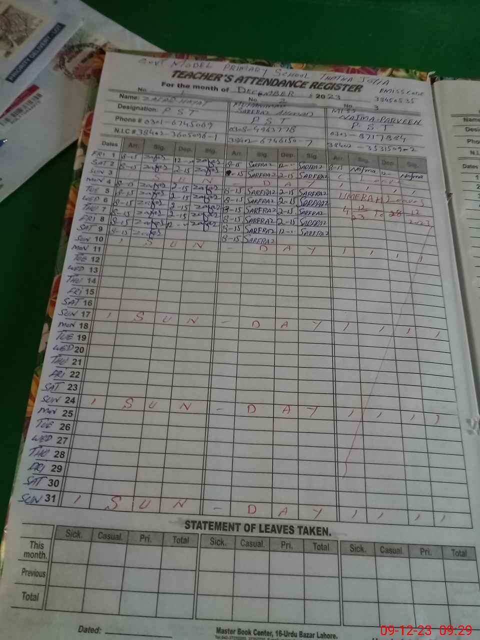| CNIC | Full Name | Designation | R/C | Absence During Last Calender Month |