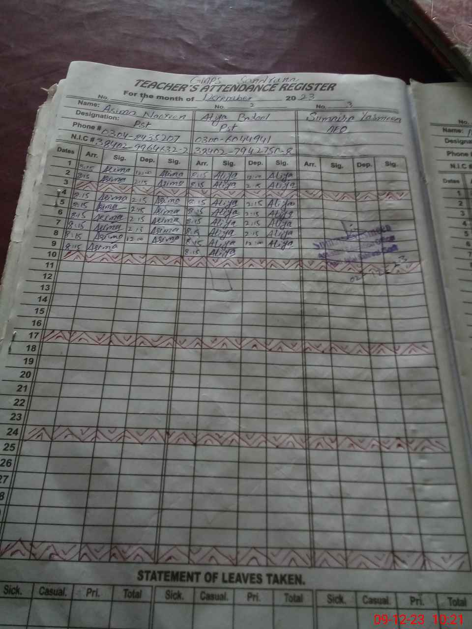 | CNIC | Full Name | Designation | R/C | Absence During Last Calender Month |