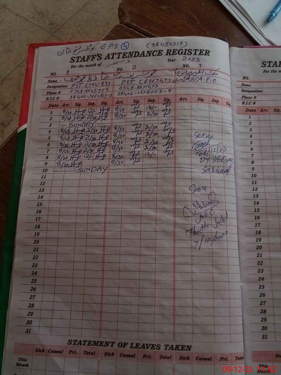 | CNIC | Full Name | Designation | R/C | Absence During Last Calender Month |