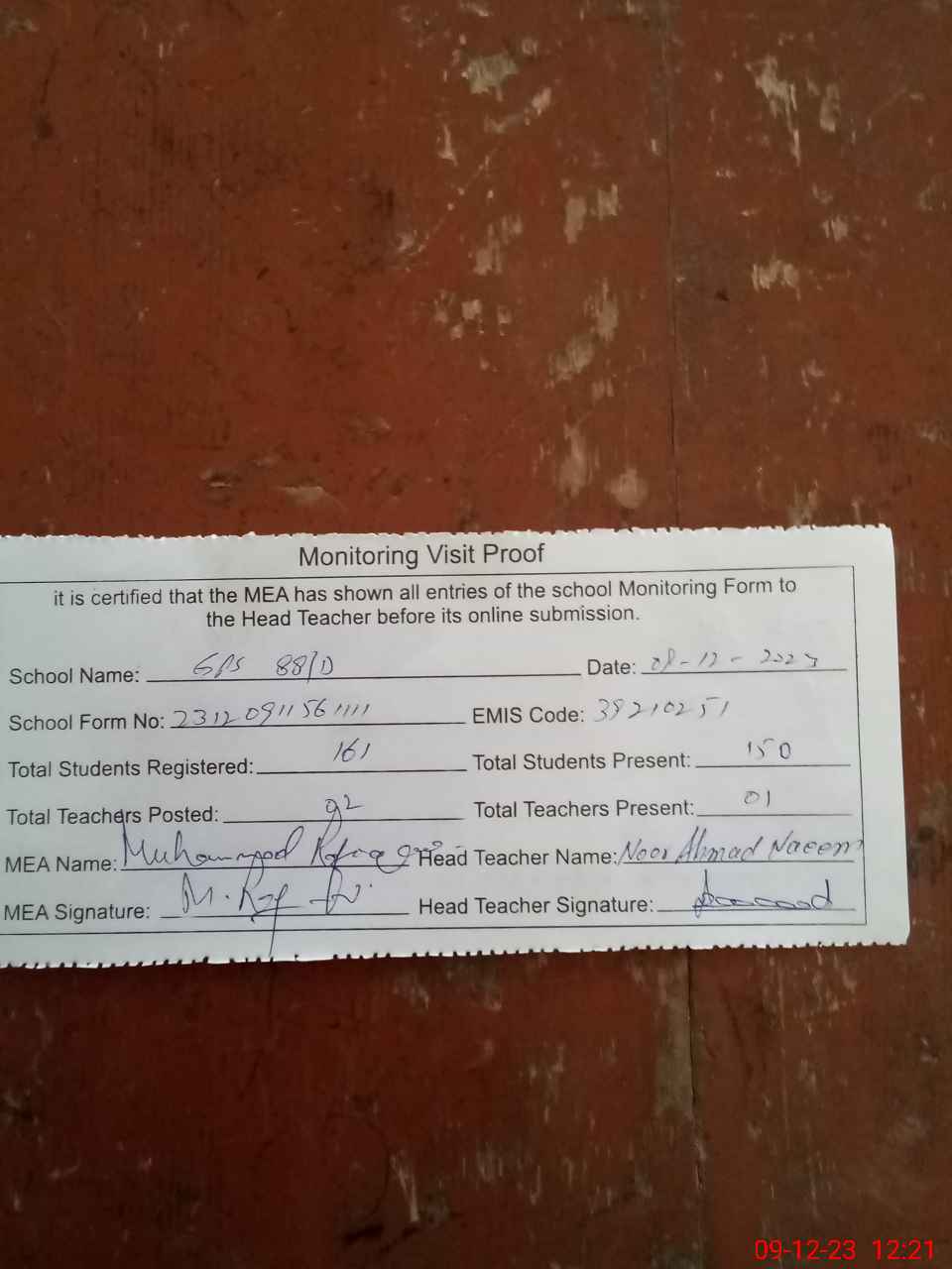 | Attendance Register | Head Teacher | MEA with School | Visit Proof |