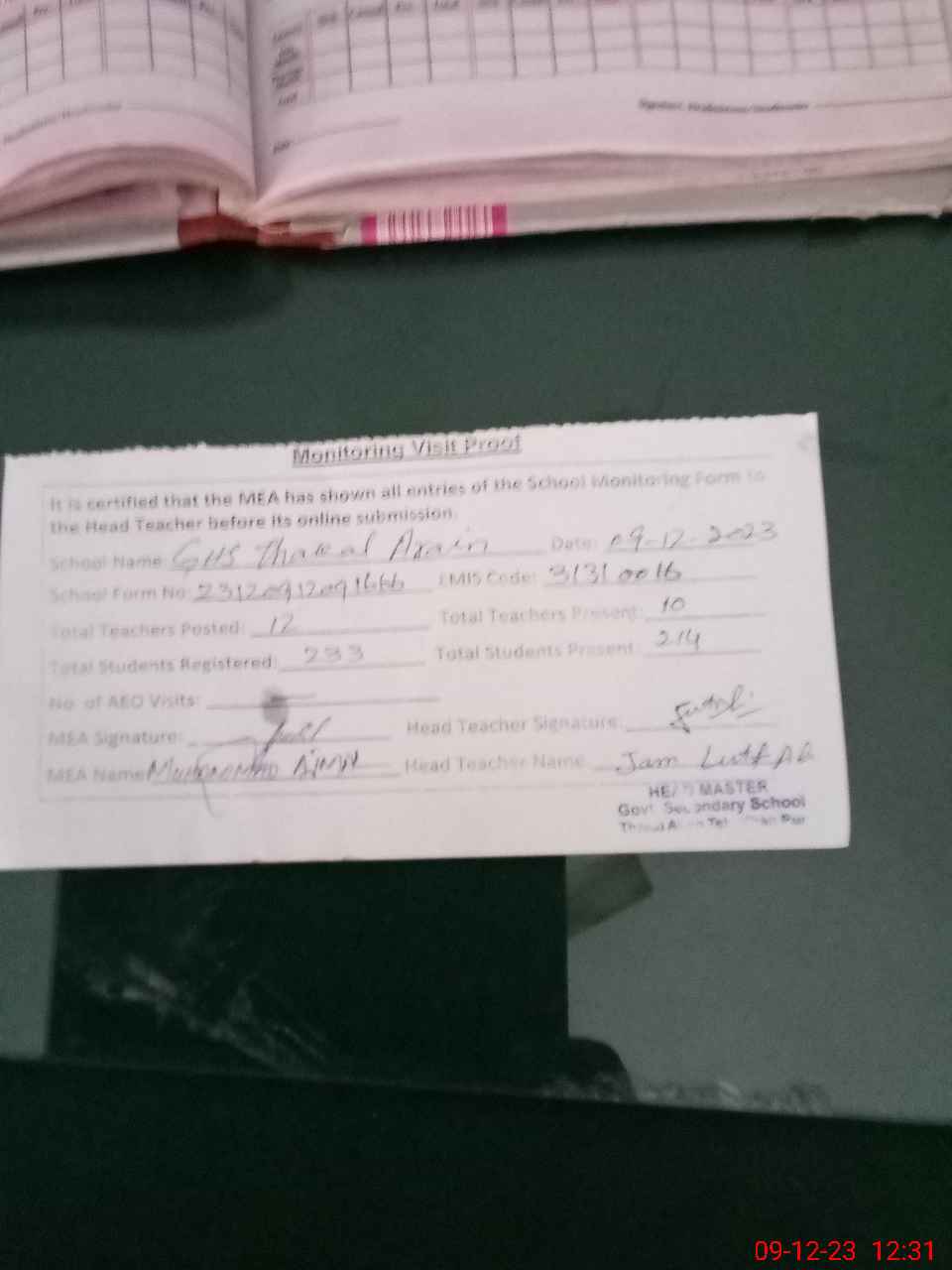 | Attendance Register | Head Teacher | MEA with School | Visit Proof |